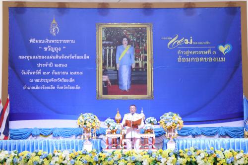 💠นายชัชวาลย์ เบญสิริวงศ์ ผู้ว่าราชการจังหวัดร้อยเอ็ด กล่าวว่า ด้วยพระมหากรุณาธิคุณ สมเด็จพระนางเจ้าสิริกิติ์ พระบรมราชินีนาถ พระบรมราชชนนีพันปีหลวง ที่ทรงห่วงใยต่อปัญหายาเสพติดที่แพร่ระบาดในสังคมไทย จึงได้พระราชทานพระราชทรัพย์ส่วนพระองค์เป็นทุนตั้งต้น“กองทุนแม่ของแผ่นดิน” ให้หมู่บ้าน/ชุมชน เพื่อรวมพลังและศรัทธาให้เป็นพลังความร่วมมือในการจัดการกับปัญหายาเสพติดด้วยสันติวิธี และต่อยอดการดำเนินการไปสู่การป้องกันและแก้ไขปัญหาสังคมอื่นๆ รวมทั้งสร้างพลังแห่งความดี สร้างพลังสามัคคีให้หมู่บ้าน/ชุมชนสามารถพึ่งพาตนเองและร่วมกันแก้ไขปัญหายาเสพติดได้อย่างยั่งยืน จังหวัดร้อยเอ็ด มีหมู่บ้านจำนวน ๒,๔๔๗ หมู่บ้าน/๒๐ ชุมชน เป็นหมู่บ้านกองทุนแม่ของแผ่นดินแล้ว จำนวน ๔๖๒ หมู่บ้าน/๑๑ ชุมชน และเป็นหมู่บ้านต้นกล้ากองทุนแม่ของแผ่นดิน ปี ๒๕๖๘ จำนวน ๒๓ หมู่บ้าน /๑ ชุมชน และมีหมู่บ้านป้องกันและแก้ไขปัญหายาเสพติด จำนวน ๑,๙๖๑ หมู่บ้าน ที่ได้ร่วมกันขับเคลื่อนกิจกรรมในการป้องกันและแก้ไขปัญหายาเสพติดอย่างเป็นรูปธรรม และเพื่อยกระดับกองทุนแม่ของแผ่นดิน สู่การเป็นศูนย์เรียนรู้กองทุนแม่ของแผ่นดิน สำนักงานพัฒนาชุมชนจังหวัดร้อยเอ็ด ได้จัดประกวดกองทุนแม่ของแผ่นดินดีเด่นระดับจังหวัด ประจำปีงบประมาณ พ.ศ. ๒๕๖๘ ขึ้น เพื่อเป็นการรวมพลังมวลชนกองทุนแม่ของแผ่นดิน และแสดงออกซึ่งความจงรักภักดีต่อสถาบันพระมหากษัตริย์ จังหวัดร้อยเอ็ด จึงได้จัดพิธีมอบเงินพระราชทานขวัญถุงกองทุนแม่ของแผ่นดิน ประจำปี ๒๕๖๘ และเชิดชูเกียรติหมู่บ้านกองทุนแม่ของแผ่นดินต้นแบบระดับจังหวัด/อำเภอ ประจำปี ๒๕๖๘ รวมทั้งมอบใบประกาศเกียรติบัตรแก่ผู้ผ่านการบำบัดยาเสพติดที่ประสบความสำเร็จ นอกจากนี้ยังมีการจัดแสดงนิทรรศการผลการดำเนินงานหมู่บ้านกองทุนแม่ต้นแบบระดับจังหวัด ประจำปี ๒๕๖๘ เพื่อแลกเปลี่ยนเรียนรู้ และถ่ายทอดผลการขับเคลื่อนกิจกรรมป้องกันและแก้ไขปัญหายาเสพติดและการสร้างความเข้มแข็งในชุมชน อีกทั้งขบวนแห่อัญเชิญเงินพระราชทานขวัญถุงกองทุนแม่ของแผ่นดิน ประจำปี ๒๕๖๘ เพื่อสืบสานพระราชปณิธานดำเนินงานป้องกันและแก้ไขปัญหายาเสพติดในชุมชน พัฒนาและเสริมสร้างความเข้มแข็งในชุมชน