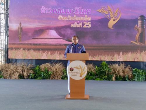 💠วันพฤหัสบดีที่ 11 ธันวาคม 2568 เวลา 10.00 น. ณ เวทีกลาง อาคารทรงงอบ บริเวณอ่างเก็บน้ำธวัชชัย ตำบลมะอึ อำเภอธวัชบุรี จังหวัดร้อยเอ็ด นายชัชวาลย์ เบญจสิริวงศ์ ผู้ว่าราชการจังหวัดร้อยเอ็ด เป็นประธานในพิธีลงนามบันทึกข้อตกลงการเจรจาค้าข้าวหอมมะลิ ในงานเทศกาลข้าวหอมมะลิโลก ครั้งที่ 25 โดยมี นายพิชัยยา ตุระซอง รองผู้ว่าราชการจังหวัดร้อยเอ็ด นายกองค์การบริหารส่วนจังหวัดร้อยเอ็ด เกษตรและสหกรณ์จังหวัดร้อยเอ็ด เกษตรจังหวัดร้อยเอ็ด สหกรณ์จังหวัดร้อยเอ็ด อุตสาหกรรมจังหวัดร้อยเอ็ด หัวหน้าสำนักงานจังหวัดร้อยเอ็ด พัฒนาการจังหวัดร้อยเอ็ด ท่องเที่ยวและกีฬาจังหวัดร้อยเอ็ด ประชาสัมพันธ์จังหวัดร้อยเอ็ด สถิติจังหวัดร้อยเอ็ด คลังจังหวัดร้อยเอ็ด ประธานหอการค้าจังหวัดร้อยเอ็ด ประธานสภาอุตสาหกรรมจังหวัดร้อยเอ็ด ประธานสภาเกษตรกรจังหวัดร้อยเอ็ด หน่วยงานราชการ คหบดี ประชาชน ร่วมพิธีฯ 💠กิจกรรมเจรจาการค้าข้าวหอมมะลิและบันข้อตกลง ในงานเทศกาลข้าวหอมมะลิโลก ครั้งที่ 25 มีกำหนดการสำคัญ ประกอบด้วย